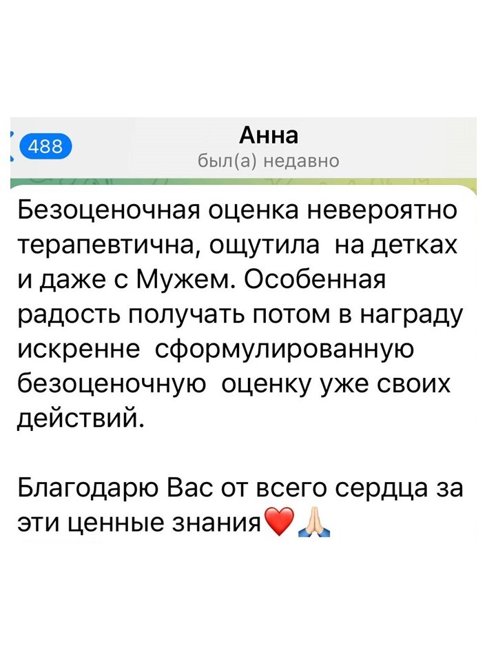 БЕЗОЦЕНОЧНАЯ ОЦЕНКА - это форма обратной связи человеку, главная задача которой – напитать другого грамотной информацией о себе, показать красоту его Личности, убирая низкую самооценку, сравнения, чувство вины, зависимость от одобрения".
