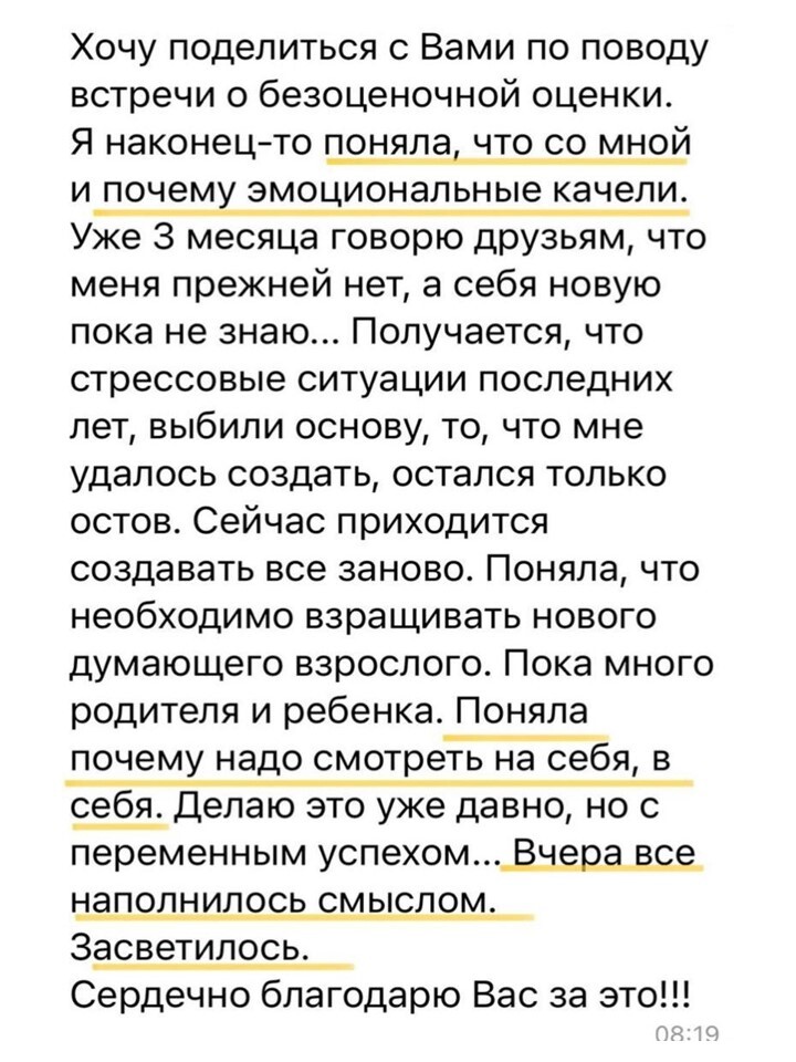"Наше общество насквозь пронизано оценочными устоями. Так хорошо, а так плохо. Этот хороший, а этот плохой. Этот умница и молодец, а этот – так себе. Сравнения, зависть, самобичевание, чувство вины, раздражение, низкая самооценка, непонимание своей ценности – вот следствия неграмотной оценки человека. Оценки, в которой нет любви к самому человеку, видения его Личности.